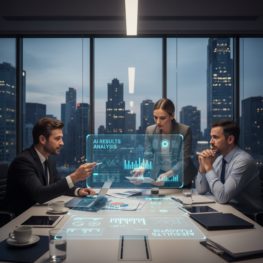 Dyrektorzy firm analizujący wyniki raportów wygenerowanych przez AI – nowy standard zarządzania informacją.