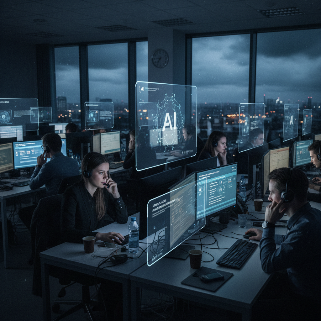 Alt: Sztuczna inteligencja w pracy polskiego biura obsługi klienta, nocna zmiana, ekran AI, obsługa zapytań.