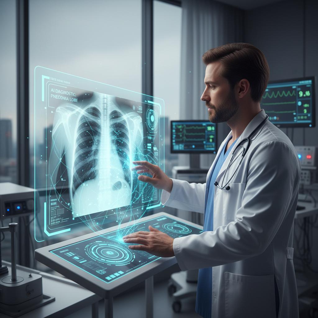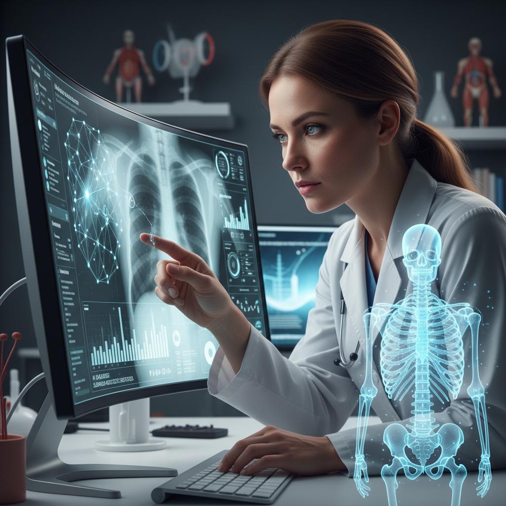 Lekarz współpracujący z systemem AI przy analizie zdjęć RTG, co przedstawia realne wdrożenie technologii.
