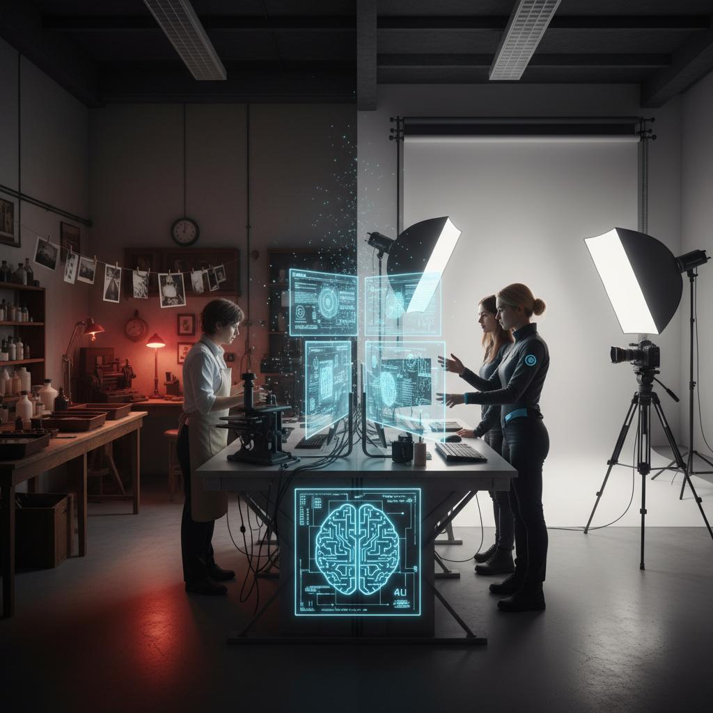 Zdjęcie przedstawia przemianę starych technik fotograficznych w nowoczesne studio cyfrowe, ilustrując ewolucję ai przetwarzania obrazu.
