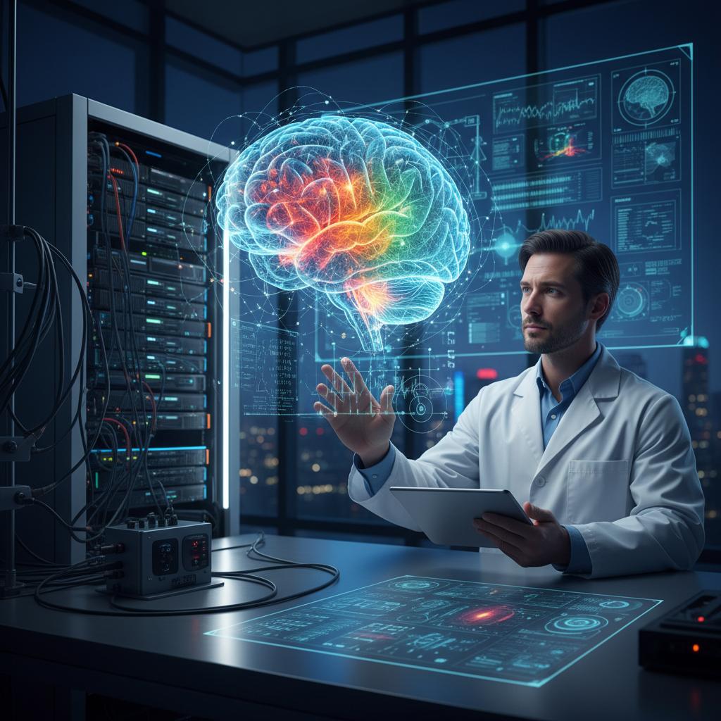 Zdjęcie naukowca prezentującego obrazy rekonstruowane przez AI na podstawie aktywności mózgu, co ukazuje przełom technologiczny.