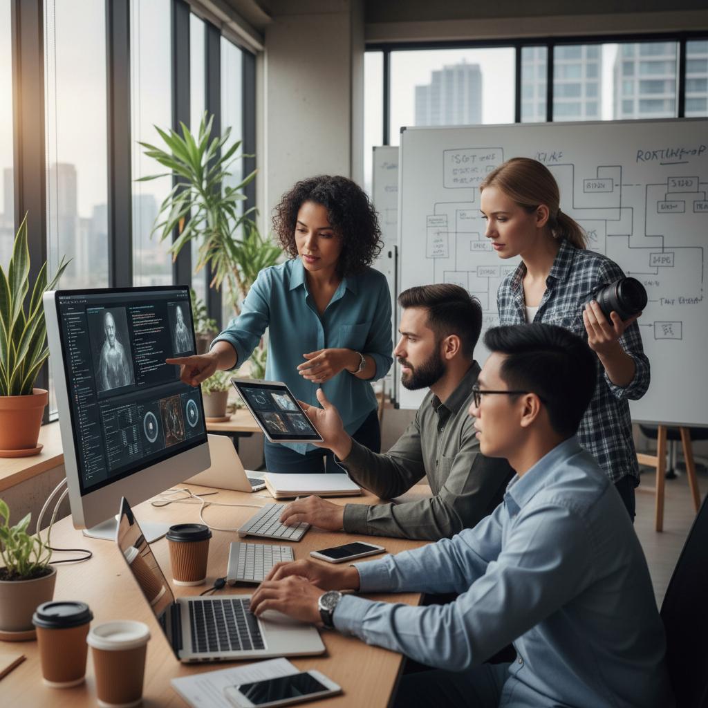 Zespół wdrażający narzędzia AI do przetwarzania obrazu, ilustracja praktycznych aspektów procesu.