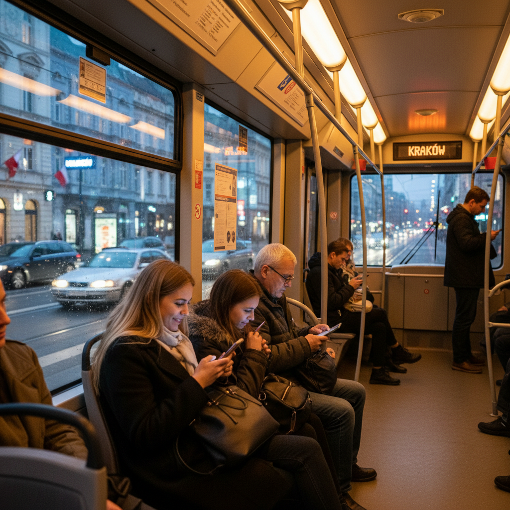 Ludzie w tramwaju zatopieni w ekranach telefonów, obrazujący problem cyfrowego wypalenia i oddalenia emocjonalnego.