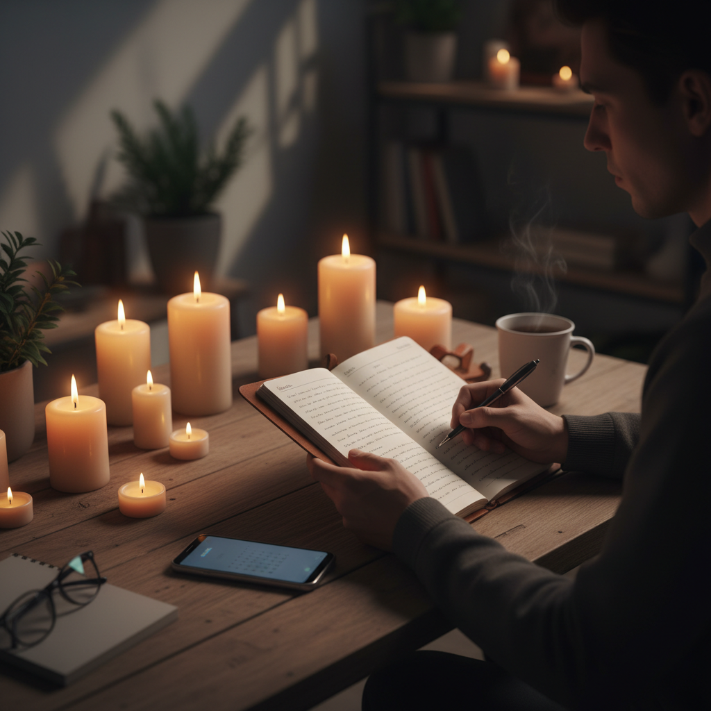 Osoba łącząca papierowy dziennik i aplikację AI w wieczornym świetle — hybrydowa praktyka wdzięczności.