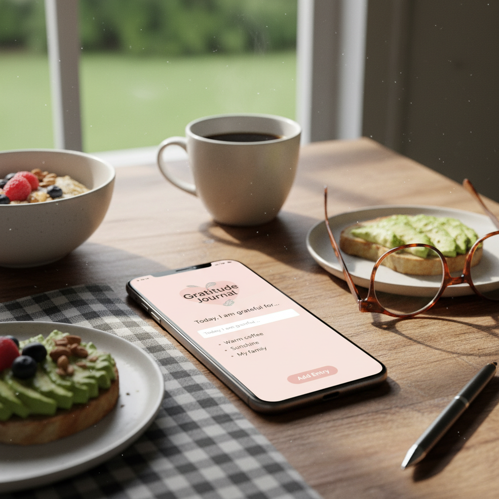 Telefon z aplikacją AI do praktyki wdzięczności na stole śniadaniowym – poranny rytuał nowej generacji.