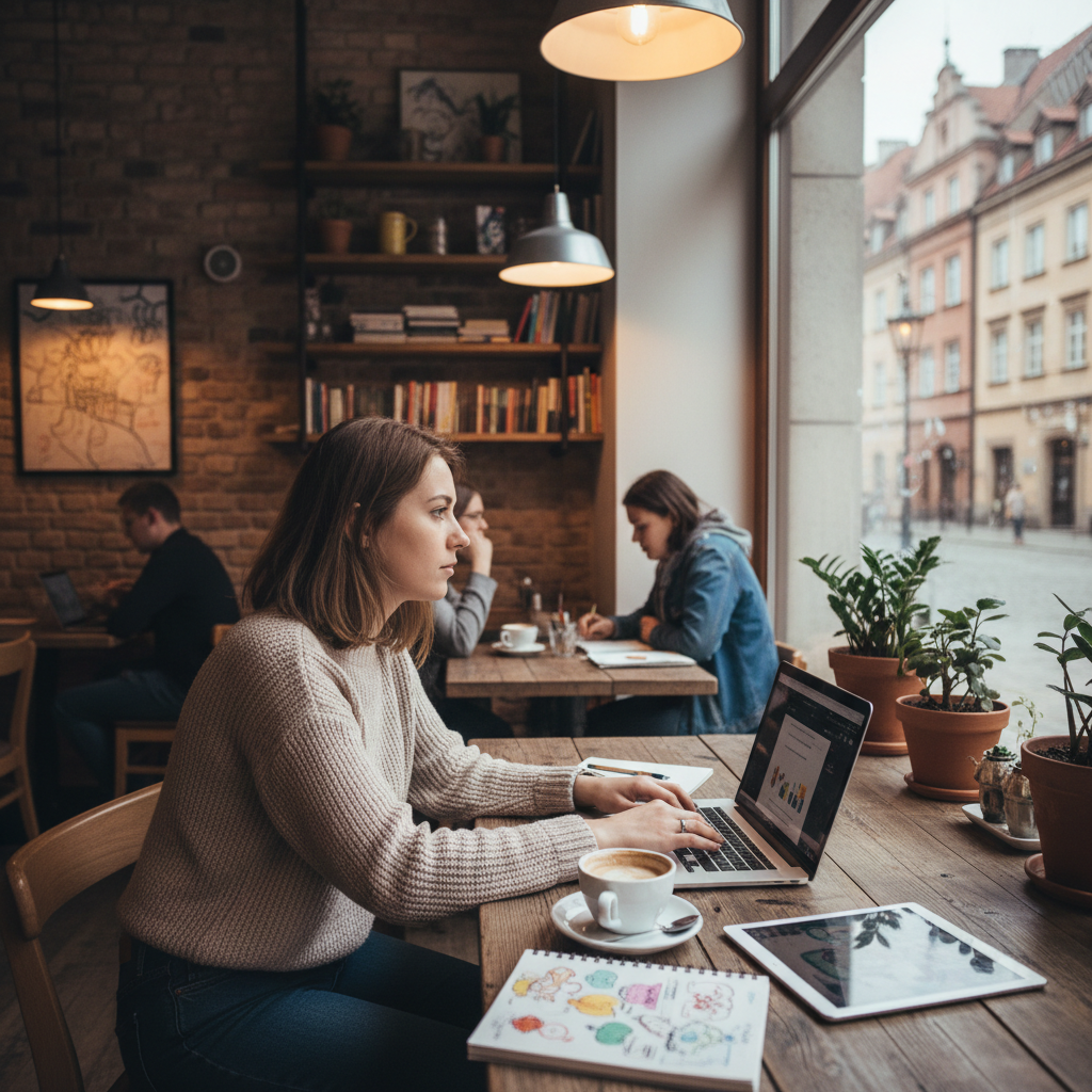 Alt: Freelancer w warszawskiej kawiarni z canva magic write na ekranie laptopa, kreatywne narzędzia dookoła.