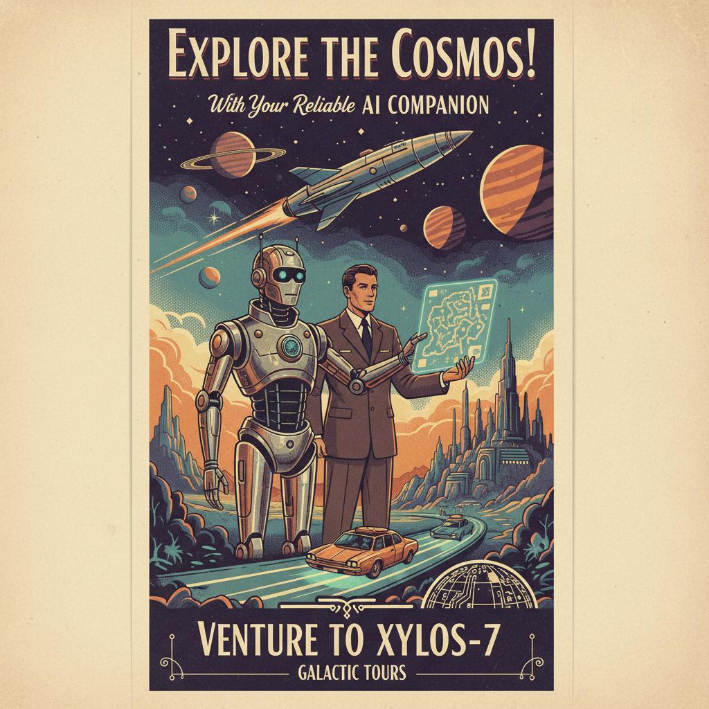 Obrazek: Sztuczna inteligencja splatająca się z tradycyjną turystyką, billboardy podróżnicze i cyfrowy asystent