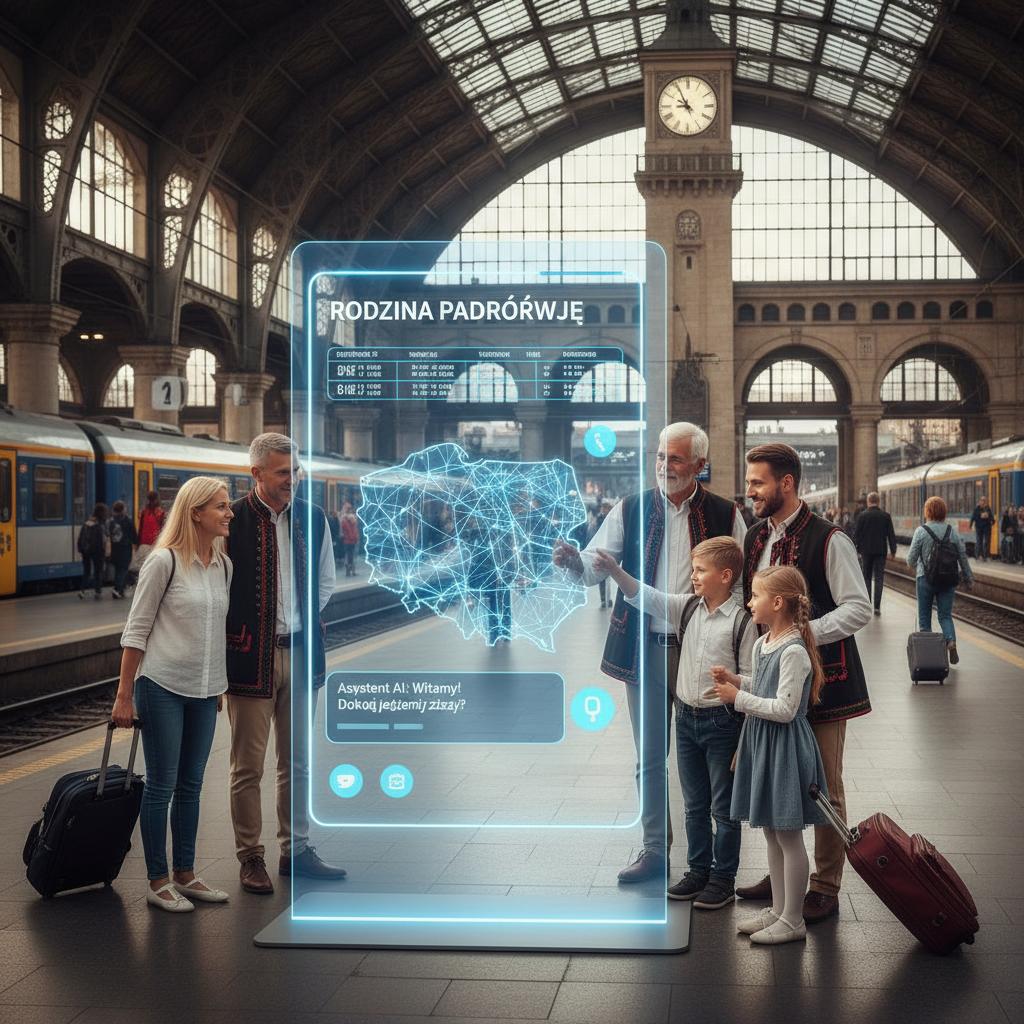 Obrazek: Polska rodzina korzysta z czatbota na dworcu kolejowym w małym mieście, podróże z AI w Polsce