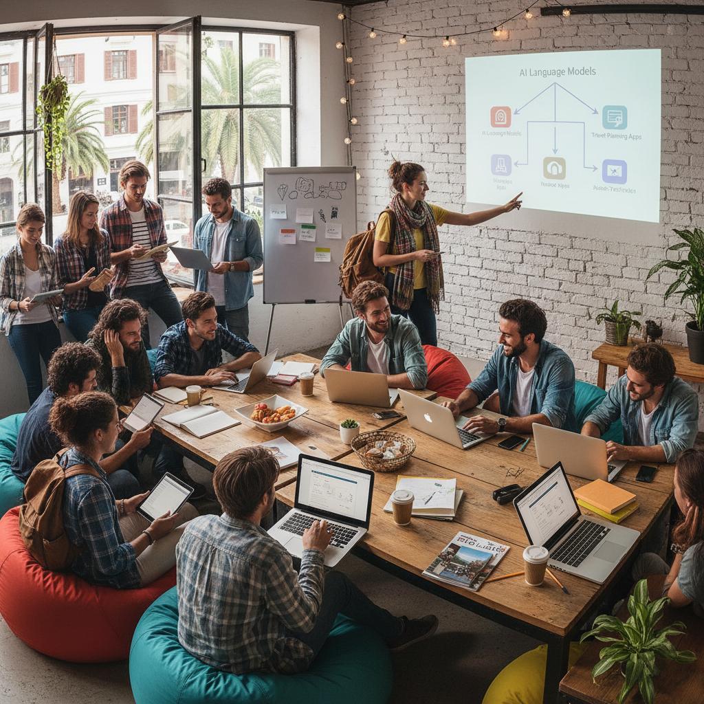 Obrazek: Grupa podróżników wymienia się doświadczeniami z czatbotami, spotkanie w hostelu z laptopami i telefonami