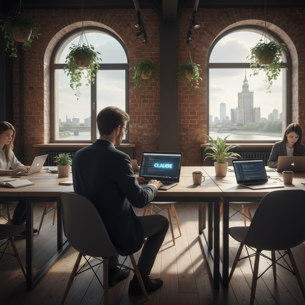 Młody profesjonalista korzystający z Claude w warszawskim biurowcu – praca z AI to codzienność.