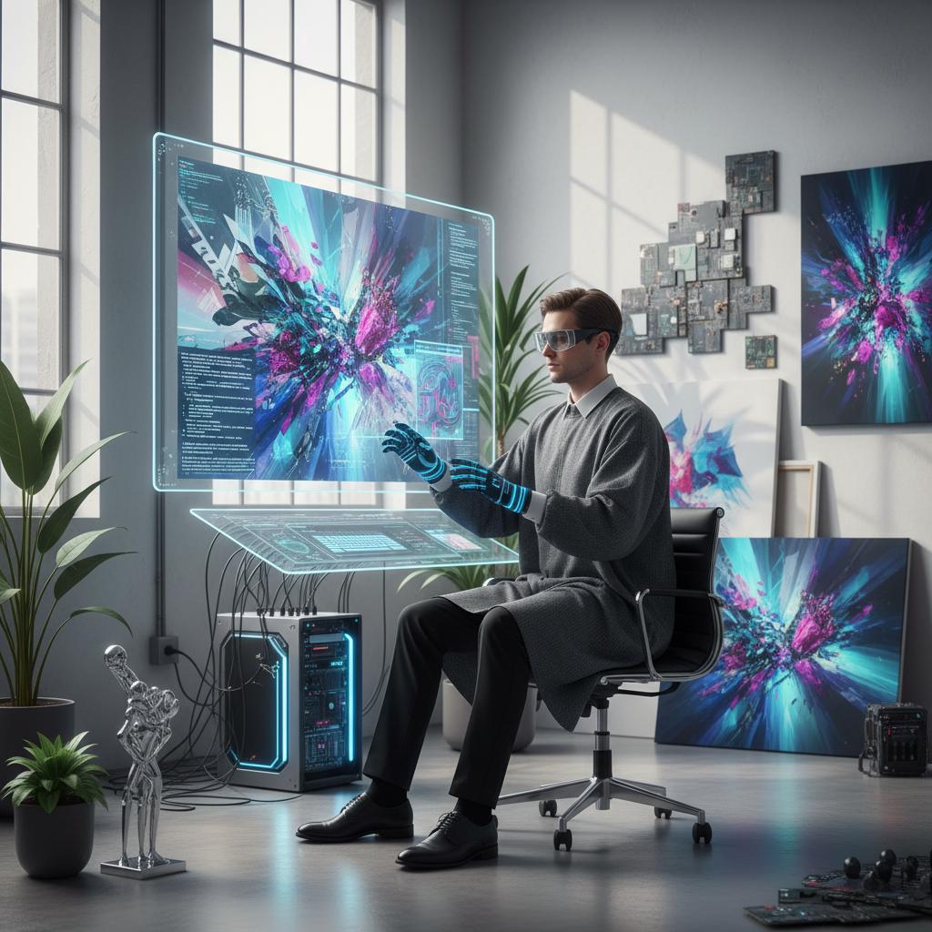 Zdjęcie przedstawia artystę wykorzystującego narzędzie AI do generowania obrazów w pracowni – nowa era kreatywności na styku człowieka i maszyny.