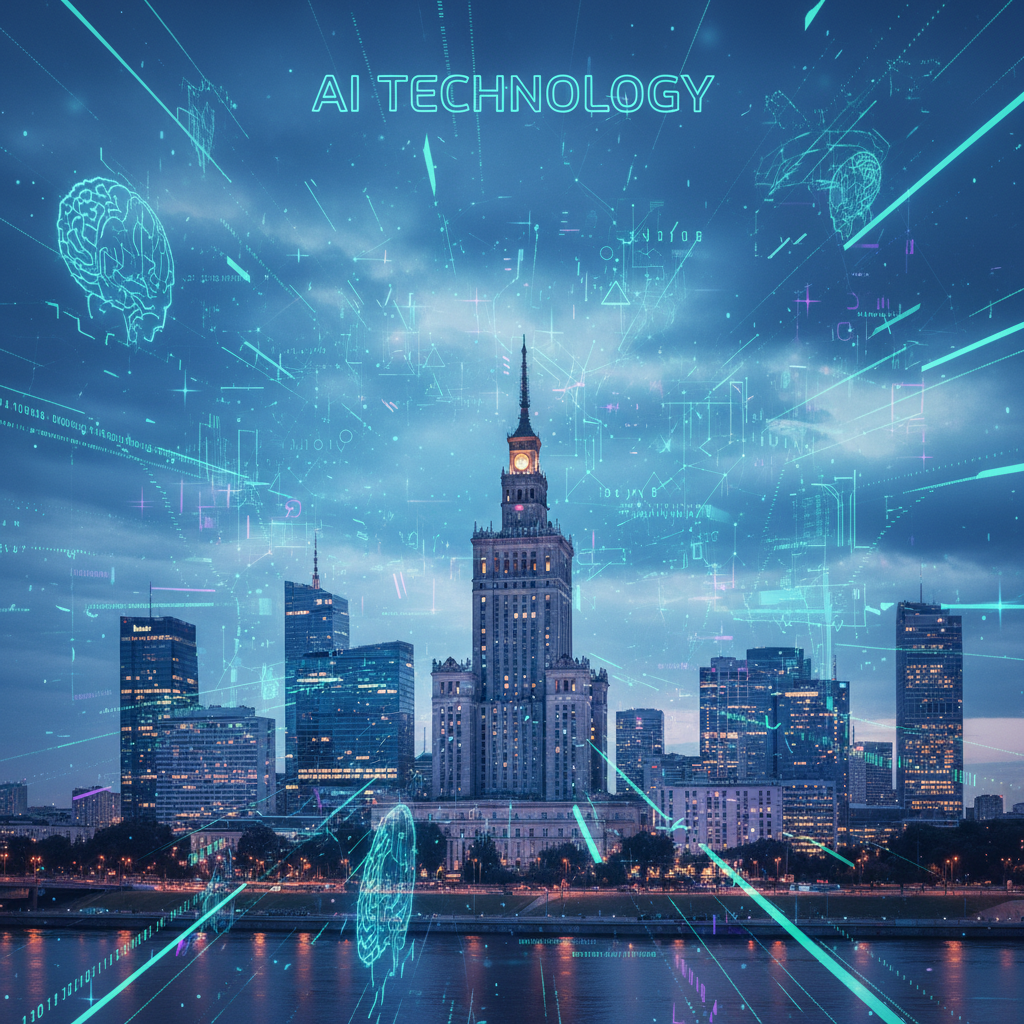 Warszawa rozświetlona cyfrowymi akcentami – symbol polskiej rewolucji AI w content marketingu.